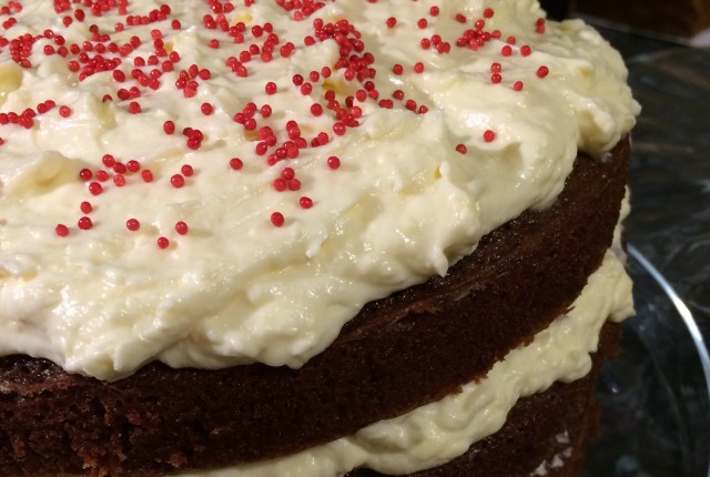 Indulge with this decadent white chocolate frosted triple-layer red velvet cake.